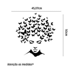 Adesivo de parede mulher e borboletas Medida: 45 x 50 cm As imagens anunciadas são ilustrativas Tamanho do adesivo O adesivo da foto parece grande Então atenção: O modelo que está na foto não se refere ao tamanho do adesivo anunciado. deixamos o adesivo grande para que você possa visualizar melhor o produto que está comprando