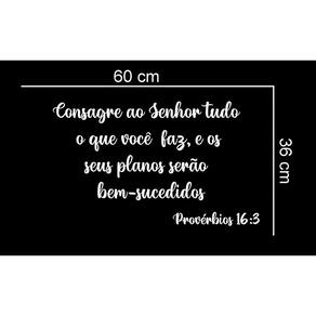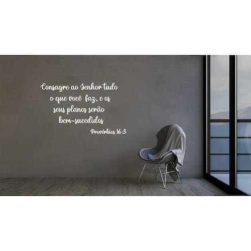 Adesivo de parede proverbios 16: 3 mod 03 Medida: 60 x 36 cm As imagens anunciadas são ilustrativas Tamanho do adesivo O adesivo da foto parece grande Então atenção: O modelo que está na foto não se refere ao tamanho do adesivo anunciado. deixamos o adesivo grande para que você possa visualizar melhor o produto que está comprando Vantagens: - já vai recortado - fácil aplicação e sem sujeira, não precisa de cola. - acompanha manual impresso. - renovação do ambiente. É o fim das paredes brancas, sem vida Onde aplicar Em qualquer superfície lisa. Onde não aplicar Paredes úmidas, superfícies porosas, com relevo, com texturas, irregularidades ou com infiltrações. Local para aplicação: aplique onde sua imaginação mandar paredes, móveis, revestimentos, azulejos, tetos, janelas, portas, vitrines, vidraças, , carros, notebook, banheiro, geladeira e muito mais. Marca: Não Informado Ean: 8001250014467