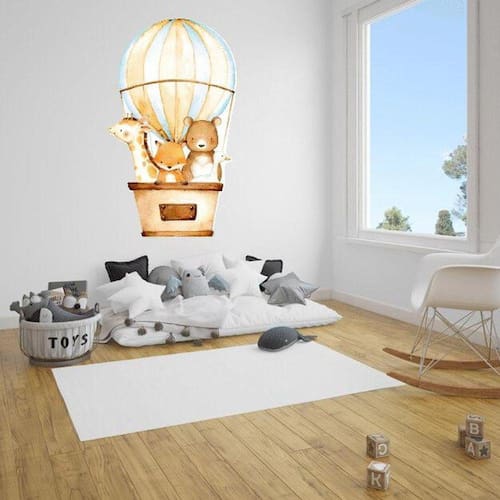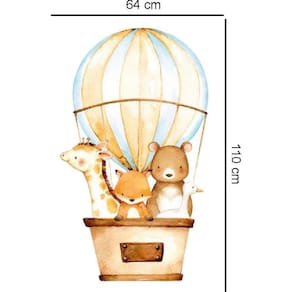 Adesivo de parede safari no balão mod02 Medida: 64 x 110 cm As imagens anunciadas são ilustrativas Tamanho do adesivo O adesivo da foto parece grande Então atenção: O modelo que está na foto não se refere ao tamanho do adesivo anunciado. deixamos o adesivo grande para que você possa visualizar melhor o produto que está comprando