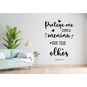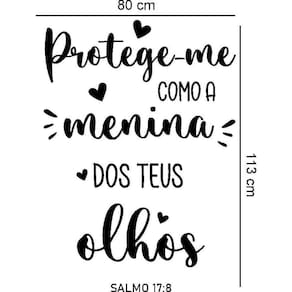 Adesivo de parede salmo 17:8 Medida: 80 x 113 cm As imagens anunciadas são ilustrativas Tamanho do adesivo O adesivo da foto parece grande Então atenção: O modelo que está na foto não se refere ao tamanho do adesivo anunciado. deixamos o adesivo grande para que você possa visualizar melhor o produto que está comprando