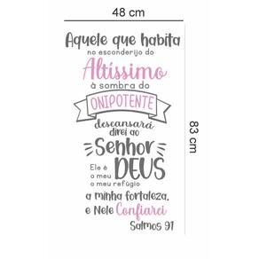Adesivo de parede salmo 91 Medida: 48 x 83 cm As imagens anunciadas são ilustrativas Tamanho do adesivo O adesivo da foto parece grande Então atenção: O modelo que está na foto não se refere ao tamanho do adesivo anunciado. deixamos o adesivo grande para que você possa visualizar melhor o produto que está comprando