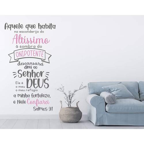 Adesivo de parede salmo 91 Medida: 42 x 73 cm As imagens anunciadas são ilustrativas Tamanho do adesivo O adesivo da foto parece grande Então atenção: O modelo que está na foto não se refere ao tamanho do adesivo anunciado. deixamos o adesivo grande para que você possa visualizar melhor o produto que está comprando Vantagens: - já vai recortado - fácil aplicação e sem sujeira, não precisa de cola. - acompanha manual impresso. - renovação do ambiente. É o fim das paredes brancas, sem vida Onde aplicar Em qualquer superfície lisa. Onde não aplicar Paredes úmidas, superfícies porosas, com relevo, com texturas, irregularidades ou com infiltrações. Local para aplicação: aplique onde sua imaginação mandar paredes, móveis, revestimentos, azulejos, tetos, janelas, Portas, vitrines, vidraças, , carros, notebook, banheiro, geladeira e muito mais. Marca: Lojinha Da Luc Adesivos Ean: 1070000012272