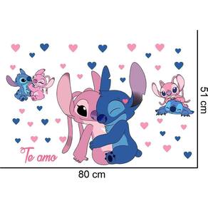 Adesivo de parede stitch e angel Medida: 80 x 51 cm As imagens anunciadas são ilustrativas Tamanho do adesivo O adesivo da foto parece grande Então atenção: O modelo que está na foto não se refere ao tamanho do adesivo anunciado. deixamos o adesivo grande para que você possa visualizar melhor o produto que está comprando
