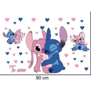 Adesivo de parede stitch e angel Medida: 90 x 60 cm As imagens anunciadas são ilustrativas Tamanho do adesivo O adesivo da foto parece grande Então atenção: O modelo que está na foto não se refere ao tamanho do adesivo anunciado. deixamos o adesivo grande para que você possa visualizar melhor o produto que está comprando