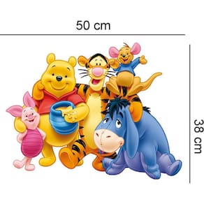 Adesivo de parede turma do pooh Medida: 58 x 38 cm As imagens anunciadas são ilustrativas Tamanho do adesivo O adesivo da foto parece grande Então atenção: O modelo que está na foto não se refere ao tamanho do adesivo anunciado. deixamos o adesivo grande para que você possa visualizar melhor o produto que está comprando