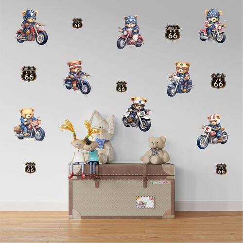 Medida: Contém 08 Adesivos de Ursinhos medindo 30x30cm Acompanha 13 Adesivos Route 66 de 10 e 8cm cada para espalhar