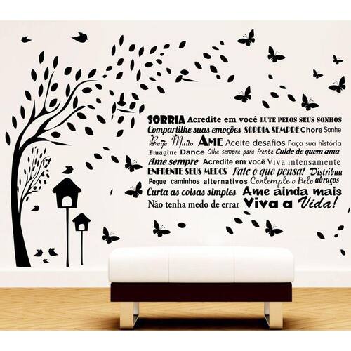 Adesivo decorativo de parede Adesivo decorativo de parede combo árvore e frase motivacional sorria acredite Tamanho alt.Xcomp. Arvore 1,10 metro por 47cmFrase 47cm x 100cmPassaros e folha de diversos tamanho DescriçãoDecore sua casa: ideal para sala, quarto, cozinha, moveis, escritório, vidros de box, janelas, portas, etc.Ótima qualidade: recortado eletronicamente em máquina de última geração.Ótimo acabamento: produzido em vinil de fácil aplicação, e pode ser removido a qualquer momento sem prejudicar a pintura ou a superfície aplicada Dica de aplicação : limpe o local com um pano úmido, certifique-se de retirar todo o pó da parede para melhor fixação do produto. Enviamos manual e temos video que ensina aplicar, de facil aplicação