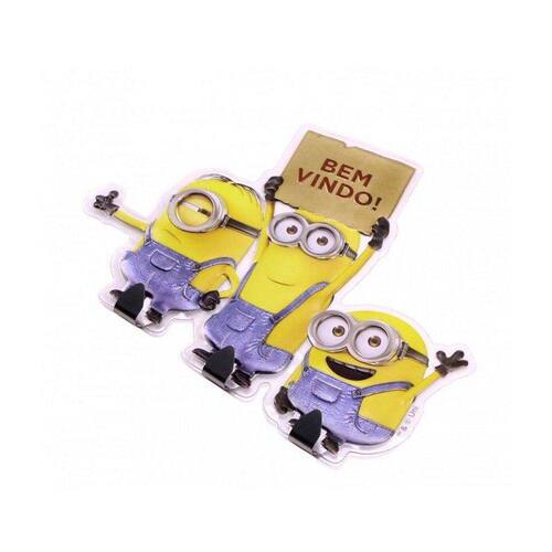 Adesivo Decorativo Com Gancho Bem Vindo - MinionsMaravilhoso adesivo dos Minions, com Stuart, Dave e Bob, ideal para colar na parede e no armário. Detalhe: vem com 3 poderosos ganchos para colocar a chave de casa ou da garagem, boné, cinto, guarda-chuva, ou até mesmo agasalho. O adesivo ainda decora o ambiente deixando-o mais alegre e vivo, afinal, é dos Minions que estamos falando.