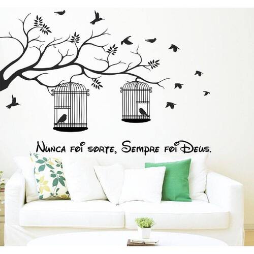 Adesivo decorativo de parede árvore com gaiolas e frase