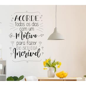 Adesivo decorativo de parede frase motivo para ser feliz Adesivo decorativo de parede Adesivo decorativo de parede frase motivo para ser feliz Tamanho alt.Xcomp. 70x47 cm Descrição Decore sua casa: ideal para sala, quarto, cozinha, moveis, escritório, vidros de box, janelas, portas, etc. Ótima qualidade: recortado eletronicamente em máquina de última geração. Ótimo acabamento: produzido em vinil de fácil aplicação, e pode ser removido a qualquer momento sem prejudicar a pintura ou a superfície aplicada Dica de aplicação : limpe o local com um pano úmido, certifique-se de retirar todo o pó da parede para melhor fixação do produto. Enviamos manual e temos video que ensina aplicar, de facil aplicação