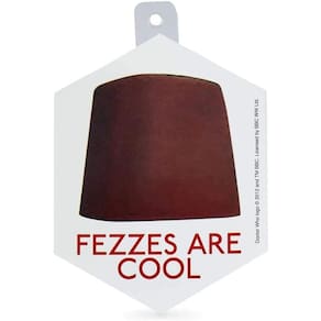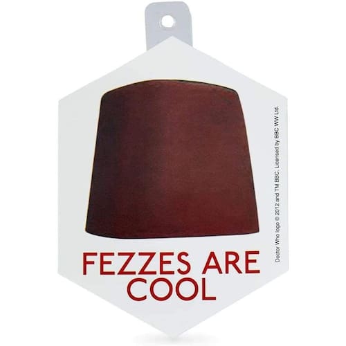 - Adesivo estelar: este adesivo colecionável oficialmente licenciado apresenta uma imagem da icônica fez vermelha do Eleventh Doctor e a frase "Fezzes Are Cool".
