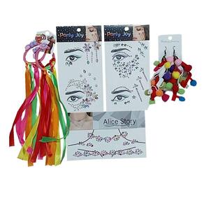 Contém: 3 Cartelas de adesivo Face Jewels + 1 Par Brincos Pompom + 1 Par Elásticos de Cabelo com Fitas.