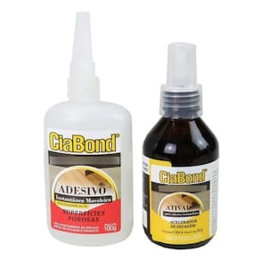Adesivo instantâneo + acelerador kit mdf cola cianoacrilato 1 adesivo instantâneo 100g + 1 acelerador de secagem 100 ml. Acelera o processo de colagem, de madeiras e móveis em geral, o adesivo não escorre e é reposícionável. Ideal para superfícies irregulares e porosas. Não é absorvido pela madeira, possui bico anti-entupimento. Já o acelerador, acelera a secagem do adesivo instantâneo. Ganhe tempo e produtividade. O ativador limpa, prepara a superfície e acelera a secagem de adesivos instantâneos a base de cianoacrilato. Evita o esbranquecimento da peça e aumenta a produtividade do profissional de mercenaria. Ideal para colagem de mdf,compensados,madeiras em geral, metais e borrachas. Modo de uso: elimine óleo e impurezas das peças. Aplique a cola em uma das partes e faça a união. Utilizado também em montagem de alto falantes. A ciabond fabricante de adesivos e selantes de alta tecnologia. No mercado desde 1º de julho de 2004 com produção própria, a ciabond é uma indústria 100% brasileira. Atendemos todo o mercado industrial e de consumo, oferecendo produtos de altíssima qualidade para todo o país.