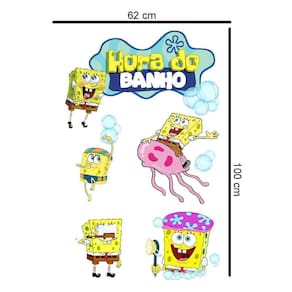 Adesivo para box hora do banho - bob esponja mod01 As imagens anunciadas são ilustrativas Tamanho do adesivo O adesivo da foto parece grande Então atenção: O modelo que está na foto não se refere ao tamanho do adesivo anunciado. deixamos o adesivo grande para que você possa visualizar melhor o produto que está comprando