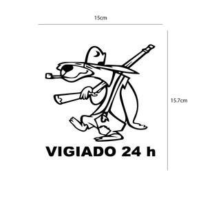 Adesivo para carro vigiado 24h Cor: preto As imagens anunciadas são ilustrativas Tamanho do adesivo O adesivo da foto parece grande Então atenção: O modelo que está na foto não se refere ao tamanho do adesivo anunciado. deixamos o adesivo grande para que você possa visualizar melhor o produto que está comprando
