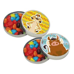 Design redondo com os icônicos personagens Simba, Timão e Pumba para uma atmosfera de aventura.