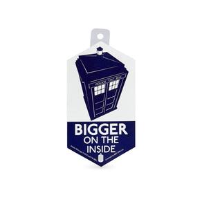- Adesivo estelar: este adesivo colecionável oficialmente licenciado apresenta uma imagem da caixa policial TARDIS e a frase "Bigger On The Inside".