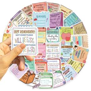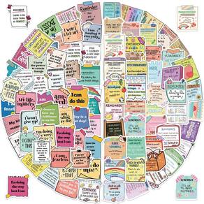 Material: papel e vinil Peso: 30-60 g Tamanho: 3-6 cm Quantidade: 50 unidades Desenhos inspiradores exclusivos: inclui 50 adesivos de afirmação diferentes com citações positivas e designs vibrantes para aumentar a confiança e espalhar boas vibrações. Impermeável e durável: feito de material de vinil premium, impermeável, resistente ao sol e à prova de arranhões para uso a longo prazo em ambientes internos e externos. Fácil de usar: parte traseira autoadesiva, aplicação peel-and-stick e fácil de remover sem deixar resíduos pegajosos. Decore em qualquer lugar: perfeito para laptops, diários, garrafas de água, skates, malas, telefones, álbuns de recortes e agendas. Ótimo para adolescentes e adultos: incentiva a positividade, a atenção plena e a motivação, tornando-os ideais para projetos escolares, de escritório e pessoais.