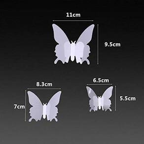 - Conjunto de 12 Borboletas 3D com adesivos para decoração versátil. - Tamanhos variados, de 5x7cm a 10x13cm. - Feitas de material resistente em plástico PVC . - Flexibilidade criativa: o tamanho final na parede depende da sua distribuição das figuras. - Ideal para composições fotográficas, decoração de quartos, salas e muito mais.