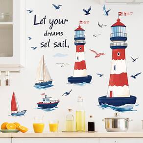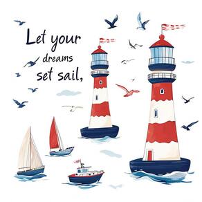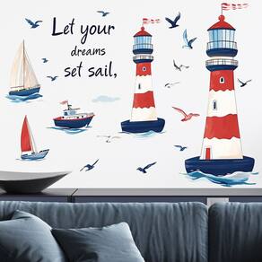 Material: PVC Tamanho: 40x59 cm Design com tema náutico com faróis vermelhos e brancos, veleiros, gaivotas e letras inspiradoras “Deixe seus sonhos zarparem”. Feito de material de PVC premium, impermeável, ecológico e seguro para espaços infantis e uso a longo prazo. Autoadesivo e removível, fácil de aplicar em superfícies lisas, como paredes, vidros, azulejos e móveis, sem deixar resíduos. Tamanho médio de 40x59 cm com vários elementos separados, permitindo um layout DIY flexível para decoração personalizada. Perfeito para decorar quartos infantis, creches, salas de jogos, salas de estar ou cozinhas, adicionando charme e inspiração à beira-mar.