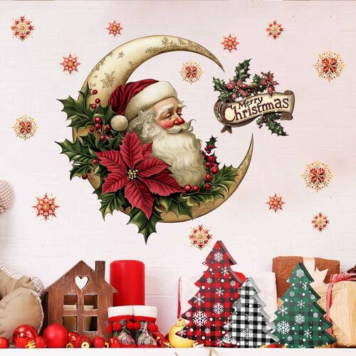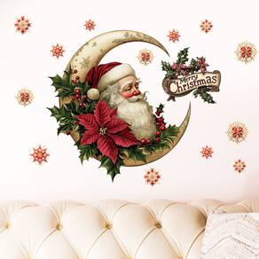 Material: PVC Tamanho: 39 x 40 cm Design criativo de Papai Noel na Lua — apresenta um Papai Noel de estilo vintage descansando na lua crescente, decorado com poinsétias, azevinho e frutas vermelhas para um toque festivo. Floco de neve e detalhes florais — Inclui flocos de neve coloridos e elementos florais que trazem charme e detalhes extras à decoração de sua parede de Natal. Ideal para espaços de férias — Perfeito para decorar salas de estar, quartos, áreas de jantar, lojas, cafés e janelas para criar uma atmosfera sazonal alegre. 🧩 Material de PVC de alta qualidade — durável, impermeável, ecológico e removível sem deixar resíduos pegajosos; reutilizável em várias temporadas de fim de ano. Tamanho conveniente — mede 39 x 40 cm, adequado para realçar paredes, portas e janelas, facilitando a complementação de qualquer tema de decoração de Natal.
