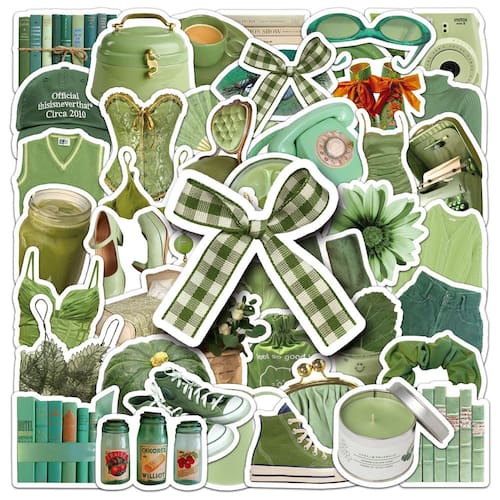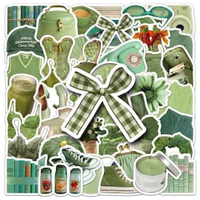 Material: papel e vinil Peso: 30-60 g Tamanho: 3-6 cm Quantidade: 50 unidades Tema verde estilo INS — Inclui 50 adesivos com laços, tênis, flores, telefones retrô, velas e itens de moda chiques em tons verdes elegantes. Vinil impermeável durável — Feitos de vinil de PVC de alta qualidade, esses decalques são à prova d'água, à prova de sol e resistentes a arranhões para uso duradouro. Easy Peel & Stick — A parte traseira autoadesiva agiliza a aplicação em laptops, garrafas, álbuns de recortes, capas de telefone, malas e muito mais. Remoção sem resíduos — Os adesivos são removidos facilmente sem deixar resíduos pegajosos, seguros para redecorar ou alterar o design a qualquer momento. Diversão criativa de bricolage — Perfeita para adolescentes, estudantes e adultos personalizarem diários, agendas, skates e acessórios de viagem com uma estética verde moderna.