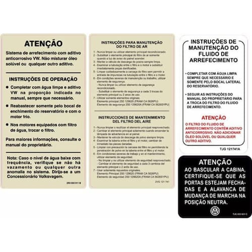 Adesivos etiquetas de advertência kit para caminhão volkswag Adesivos etiquetas de advertência kit para caminhão volkswagen cmetiq01 fixo fgc Características: Adesivo impressão uv resistente a sol e chuva. Marca: starpac Vantagens: Vinil do tipo permanente com mais desempenho e estabilidade. Fabricante nacional de películas; Durabilidade de em média até 4 anos após aplicação; Resistência térmica, química, à umidade e à corrosão; Adesivo calandrado de fácil aplicação e alto grau de aderência. Adquira adesivos de qualidade Adesivo impresso com tinta uv, resistente a sol e chuva Aceita verniz automotivo exceto adesivos resinados Material próprio para linha automotiva Itens inclusos: 4- unidades de adesivos Ref: spts-ad-734-r Info: Características: Alta qualidade e durabilidade. Material adesivo autocolante. Fácil aplicação. Suporta aplicação de verniz automotivo quando o adesivo não for resinado Produzido com recorte eletrônico. Ótima aderência. Resistente a chuva e raios uv. Não perde coloração. / entrega: Despachamos em até 24 horas úteis após confirmação de pagamento. Embalagem com proteção para transporte. Instalação: Limpe cuidadosamente as peças onde os adesivos serão aplicados, retirando todos os resíduos poeira, gordura, óleo, desengripante etc... Não utilizar materiais abrasivos sobre os adesivos. Após aplicação a cola leva até 48 horas para finalizar sua cura total. A spts produz adesivos automotivos seguindo medidas e cores compatíveis com o mercado. Trabalhamos com materiais de ponta, garantindo assim sua qualidade e também o melhor custo benefício para você. Possuímos adesivos para toda a linha automotiva, motos, caminhões, máquinas pesadas, máquinas agrícolas e também itens de personalização e resinados. Marca: Não Informado