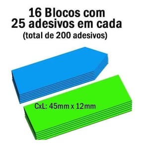 Permitem a escrita de caneta e lápis. São reposicionáveis e de fácil aplicação. Acompanha régua. Dimensões Bloco Adesivo 45x12mm com 200 Folhas cada e com 8 cores