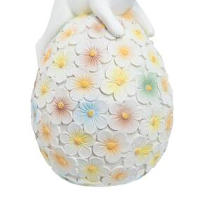 O Adorno Coelho Mabel tem 16 cm e é produzido em resina, com padrão floral no ovinho.
