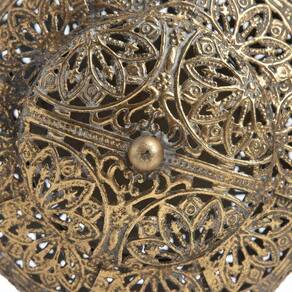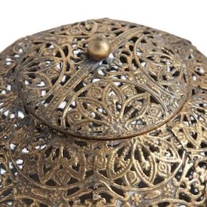 O Potiche Isra é produzido em metal vazado com 16 cm e possui tampa, com acabamento em dourado envelhecido.