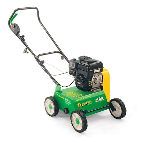 Especificações Técnicas: Rodas de termoplástico com bucha sinterizada. Equipados com motores TRAPP (Lifan), movidos a gasolina comum (não aditivada). Lubrificante: Óleo SAE 20W50 – Efetuar 1ª troca após primeiras 5 horas de trabalho e as próximas a cada 50 horas de trabalho. Filtro de ar: Limpe a cada 25 horas de trabalho ou anualmente. Substitua a cada 50 horas ou anualmente. Lâminas rotativas fixas: Em aço especial. Separadas por espaçadores com intervalo de 30,4 mm. Regulagens de altura: Em 5 posições (9,7 mm, 6,3 mm, 2,5 mm, -1,5 mm, -5,7 mm). A cabamento: Todas as peças metálicas recebem tratamento anticorrosivo e pintura com tinta a pó de poliéster polimerizado em estufa a 220 °C, garantindo maior durabilidade e acabamento. Rendimento aproximado: 1.000 m2/h. Faixa de aeração: 40cm Potência motor (hp): 3,5 Combustível: Gasolina Lâminas rotativas: 12 Cap. tanque comb.: 2 litros Cap. óleo cárter: 0,6 litro