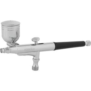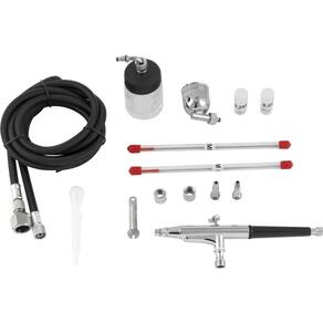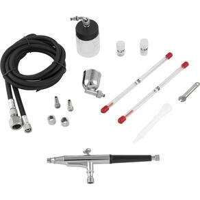 1 Aerógrafo com 15 acessórios. Acompanha: 3 bicos (0,2 mm, 0,3 mm e 0,5 mm), 3 agulhas (0,2 mm, 0,3 mm e 0,5 mm), 1 copo de metal 7 ml, 1 copo de vidro 22 ml, 1 chave, 1 mangueira 1,8 m, 1 conector 1/8" fêmea com espigão 1/4", 1 tudo de sucção e 2 adaptadores rápidos.