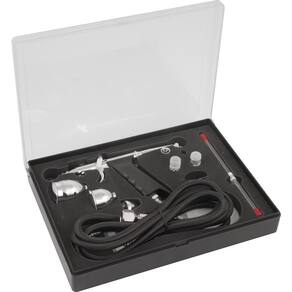 1 Aerógrafo com 16 acessórios, sendo: 1 pistola, 1 mangueira com 1,8 metros, 3 copos (2 ml, 5 ml, 13 ml), 3 bicos (0,2 mm, 0,3 mm, 0,5 mm), 3 agulhas (0,2 mm, 0,3 mm, 0,5 mm ), 1 chave, 1 adaptador (1/4" NPT fêmea - 1/8" NPT macho), 2 conectores para mangueira (rosca 1/8? NPT fêmea com espigão 3/16?) e 1 tubo de sucção