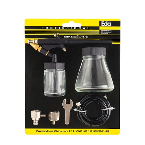 Aerógrafo pneumático tipo caneta - eda aerógrafo extremamente prático de usar. De ótima qualidade, acompanha mangueira de ar, válvula adaptadora para refil de ar comprimido e adaptador para compressor, além de recipientes para preparo e armazenamento da tinta. - marca: eda - modelo: 9mv - ótima qualidade e acabamento - frascos de vidro - leve e portátil - spray padrão ajustável de 1/4" a 1" para máxima versatilidade - pressão: 15-50 psi - peso: 270g - dimensões da embalagem: 20cm x 16cm - garantia: 90 dias obs: deve ser utilizado com compressor tufão de 40 libras ou compressor de reservatório. Itens inclusos: - 1 aerógrafo de ação simples - 1 mangueira de ar - 1 reservatório de tinta: 20ml - 1 recipiente para preparo de tinta: 56ml - 1 adaptador 1/4" para compressor - 1 válvula adaptadora para refil de ar comprimido - 1 chave para montagem e desmontagem - atenção. Esta ferramenta só pode ser utilizada se conectada a um compresso Ean: 7895315013943