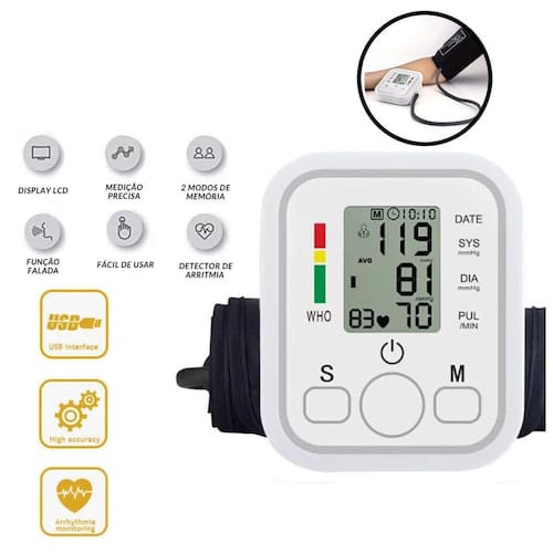 Aferidor arterial - aferição digital para controle total Mantenha as medições arterial e pulsação sempre em dia com este incrível equipamento avançado que realiza leituras da pressão sistólica, diastólica e de pulso, além de detectar arritmia cardíaca e possui indicador de hipertensão. Sua tecnologia inteligente permite o controle da inflação ao nível ideal, proporcionando uma medição mais confortável e precisa. Funções técnicas: - indicador de arritmia. - indicador gráfico de nível de hipertensão. - indicador de batimentos cardíacos. - detecta batimentos cardíacos irregulares - operação simples basta um toque para ligar e medir automaticamente. - desligamento automático: 1 minuto. - recurso de hora e data para até 2 usuários. - mede pressão sanguínea sistólica e diastólica e pulsação frequência cardíaca - memória total de 198 resultados com hora e data. - tela digital lcd: alta resolução e baixo consumo de energia - possui função de voz, fala o resultado obtido em português - possui 2 unidades de medida: kpa e mmhg. - precisão clinicamente comprovada de acordo com os protocolos do inmetro - certificados: ce, iso e rohs - braçadeira com circunferência de 22 cm a 32 cm extra grande , fácil de usar e ajustável. atende aos pacientes obesos . - método de medição: oscilométrico; - medição no braço - alimentação: 4 pilhas aaa ou por entrada micro usb - totalmente automático: controle de inflação e liberação rápida - faixa de medição: - pressão sanguínea: 40mmhg - 280mmhg 5.3kpa - 37.3kpa / - ritmo cardíaco: 40x/min - 195x/min - precisão da medição: - pressão: +-0.4kpa +-3mmhg / - ritmo cardíaco: - 5% - peso: 330g sem pilhas Itens inclusos 01 medidor . 01 estojo para armazenamento 01 braçadeira extra grande 22 cm x 32 cm 01 manual de instruções Produto possui registro e certificação nº 2020202070176 Produto nº 20200328 - gb9706.1-2007 Fda registration certificate fiscal year 2020 nº 10072274 Certificate of conformity fda nº 10064773 Certification europe nº iso13485:2016 Lot: wo2005001 ====================== Dúvidas frequentes - o medidor é à pilha ou fonte Você pode escolher se prefere usar com pilha, ou fonte usb. - o produto é resistente Trabalhamos apenas com produtos com material de altíssima qualidade, durabilidade e procedência. Marca: Não Informado