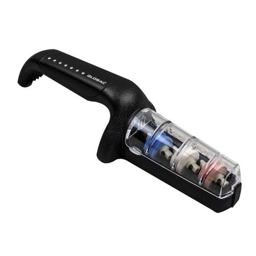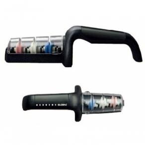 Afiador Amolador De Facas Com 3 Estágios Global O Amolador para Facas se destaca por sua praticidade de utilização. Seu formato conta com três estágios: A roda de grão grosso azul é para afiar bordas sem brilho e lascadas (desgaste), a roda de grão médio marrom é para afiação padrão (amolação), e a roda superfina amarela é para polir e refinar as bordas (afiação).O apoio para a mão que dá base de sustentação, garante que o produto não deslize durante o manuseio. Outro diferencial do amolador é que as pedras já estão no ângulo correto para afiação. Basta umedece-las e começar o processo de afiação. Baseada em conceitos milenares de forjamento de lâminas e inspirada nas poderosas espadas dos samurais, a Japonesa Global Knives detêm conhecimentos suficientes que a destaca como a melhor produtora de lâminas para fins culinários do mundo, atendendo os padrões mais exigentes e recebendo uma série de prêmios, como o da renomada revista americana Restaurant Magazine.Pela 6 vez consecutiva, vitoriosa na categoria de faca Choice Awards em 2015.Ficha Técnica:- Código: 4082060036- Marca: Global- Conteúdo da Embalagem: 1 Amolador- Material: Cerâmica e Plástico- Cor: Preto- Peso: 325g- Dimensões: 27cm x 8,9cm x 6,4cm (AxLxP)- Garantia: 3 Meses (Contra defeito de fabricação) Sobre a Marca - Apesar de fundada apenas em 1985, a Global Knives se baseia no conhecimento japonês milenar de forjamento de lâminas. Há mais de mil anos o Japão já era conhecido por possuir ferreiros e forjas que produziam os metais cortantes mais fortes e afiados do planeta, fama esta que acompanhou a linhagem dos tradicionais guerreiros samurais. Quanto mais respeitado o samurai, melhor era sua espada. Até hoje a Global Knives detém conhecimentos que os colocam como os melhores produtores de lâminas para fins culinários no mundo. Marca: GLOBAL ALUMÍNIOS