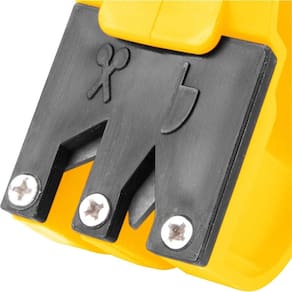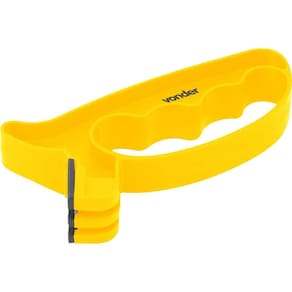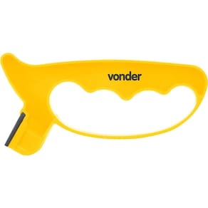 Afiador 2 em 1, pois possui 2 pastilhas de metal duro (vídea) sobrepostas em formato V para afiar facas e 1 pastilha de metal duro (vídea) em ângulo para afiar tesouras, proporcionando praticidade e rapidez na operação e perfeito acabamento. Indicado para afiar facas e tesouras.