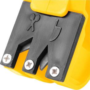 Afiador 2 em 1, pois possui 2 pastilhas de metal duro (vídea) sobrepostas em formato V para afiar facas e 1 pastilha de metal duro (vídea) em ângulo para afiar tesouras, proporcionando praticidade e rapidez na operação e perfeito acabamento. Indicado para afiar facas e tesouras.