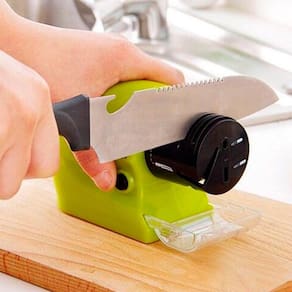 Afiador elétrico portátil multifuncional, afia facas de cozinha, tesouras e ferramentas manuais. Equipado com pedra de amolar de alta velocidade. Possui acessório removível e coletor de pó. Necessita de 4 pilhas AA (não inclusas).Vendido e entregue por Olist SP