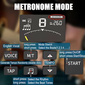 - ?Função de metrônomo digital?O metrônomo tem três diferentes tons de batida para escolher (tom eletrônico nítido, tom de batida de metrônomo mecânico de imitação, etc. ), e o metrônomo também pode ser ligado com uma função de contador vocal em inglês para satisfazer suas necessidades de uso em diferentes ocasiões. O metrônomo tem uma faixa de batida precisa de 30-260 BPM. O metrônomo tem 10 (0, 1, 2, 3, 4, 5, 6, 7, 8, 9) batidas para escolher e 8 padrões rítmicos