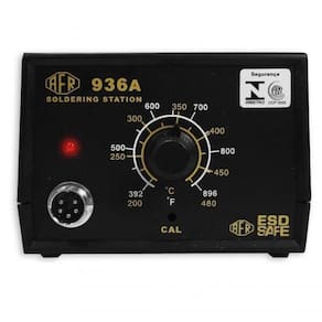 Estação de solda - modelo analógicoIdeal para quem busca praticidade, agilidade e segurança para trabalhar nos seus reparos da maneira funcional aumentando significativamente a precisão e a agilidade durante seus processos de soldagem.Para maior conforto o cabo do ferro de solda da estação afr 936-a é produzido em material flexível que proporciona maior liberdade de movimento. Para maior segurança do operador o ferro de solda possui partes emborrachadas para melhor aderência junto às mãos, evitando possíveis escapadas e danos tanto a sua estação de solda quanto ao operador que estará lhe utilizando no momento.Desenvolvida para profissionais da eletrônica, através do padrão esd safe a estação de solda afr 936-a possui uma série de ajustes que possibilitam maior segurança ao operador.Para garantir maior usabilidade e segurança durante os processos de soldagem, a estação de solda afr 936-a possui inclusa em sua embalagem uma base metálica para apoio do ferro de solda enquanto o mesmo não estiver sendo utilizado, além de uma esponja vegetal utilizada para efetuar a limpeza da ponta de solda para evitar danos e deterioramento da mesma.A estação afr 936-a conta com ajuste de temperatura analógico que varia na faixa de 200 a 480ºc.Especificações:- modelo esd dissipativo ;- potência: 50w;- tensão de entrada: 110v ou 220v;- temperatura: 200 - 480ºc ;- resistência cerâmica - 24v;- ferro, ponta e estação aterrados;- ajuste de calibração;- dimensões: 170 x 120 x 93mm;- peso aproximado: 1,4 kg. 2 anos de garantia contra defeitos de fabricação