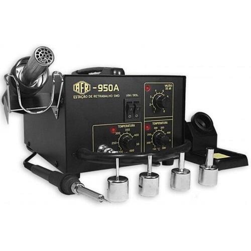 Estação de retrabalho e solda - modelo analógico A estação dupla afr é ideal para quem trabalha com eletrônica e necessita de uma estação específica para ressoldagens e troca de componentes smd e pth. Sendo 2 em 1 ela possui controle de temperatura no canhão de ar para smd e controle de temperatura no ferro de solda para pth . Possui certificado do inmetro. Características: Retrabalho ar quente Controle da temperatura na faixa de 150 a 500 c; Precisão de controle da temperatura: menor que 2% Gabinete esd dissipativo; Resfriamento automático; Bomba tipo diafragma; Vazão de ar: 0,3 - 24,0 l/min. ajustável ; Resistência: 250 watts Bomba consumo: 45 watts; Consumo total: 270 watts para 127v / 340w para 220v Tensão: 127 ou 220 volts; Terceiro fio de aterramento; Solda: ferro de solda Potência: 50 watts Controle de temperatura na faixa de 200 - 480 c Resistência de cerâmica - 24v Ferro, ponta e estação aterrados 2 anos de contra defeitos de fabricação Marca: Não Informado