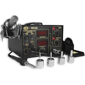 Estação de retrabalho e solda - modelo digital A estação dupla afr é ideal para quem trabalha com eletrônica e necessita de uma estação específica para ressoldagens e troca de componentes smd e pth. Sendo 2 em 1 ela possui controle de temperatura no canhão de ar para smd e controle de temperatura no ferro de solda para pth . Possui certificado do inmetro.Estação digital para retrabalho com display de 3 dígitos. Características:Retrabalho ar quente Display de 3 dígitos. Controle da temperatura na faixa de 150 a 500 c; Precisão de controle da temperatura: menor que 2% Gabinete esd dissipativo; Resfriamento automático; Bomba tipo diafragma; Vazão de ar: 0,3 - 24,0 l/min. ajustável ; Resistência: 250 watts Bomba consumo: 45 watts; Consumo total: 270 watts para 127v / 340w para 220v Tensão: 127 ou 220 volts; Terceiro fio de aterramento;Solda: ferro de solda Display de 3 dígitos. Potência: 50 watts Controle de temperatura na faixa de 200 - 480 c Resistência de cerâmica - 24v Ferro, ponta e estação aterrados 2 anos de garantia contra defeitos de fabricação