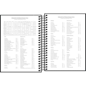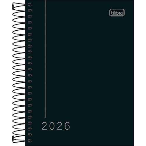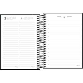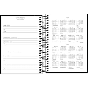 Capa: Dura Espiral: Colorido Folhas: Pautadas decoradas Formato: 117mm x 164mm Gramatura: 63 g/m² Produto certificado: FSC Número de folhas: 160 folhas Visão: Diária exceto sábado e domingo Miolo Cor: Preta