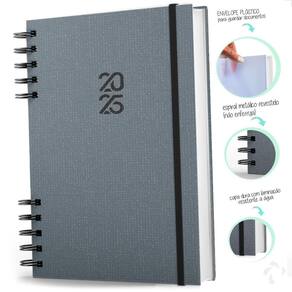 Acompanha um envelope plástico para guardar documentos, papéis e itens importantes, com fechamento em elástico e wire-o preto, conferindo elegância e sofisticação.