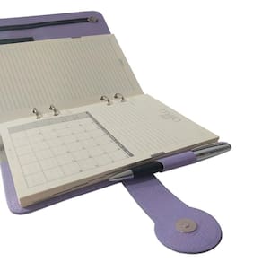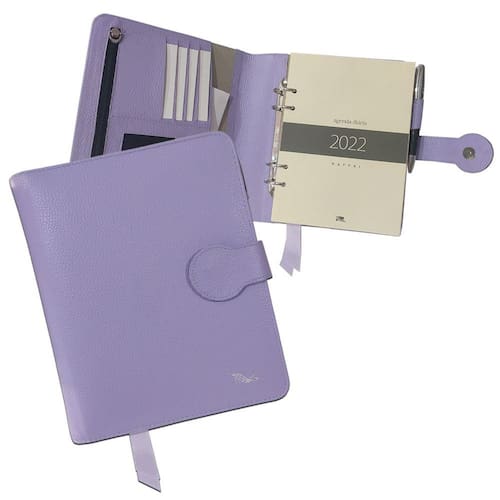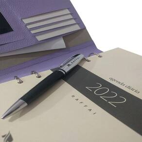 Agenda tipo fichário contendo, dados pessoais, calendários, datas importantes, anotações mensais, planejamento mensal, um dia por página (com exceção dos finais de semana), planejamento para o próximo ano, índice telefônico e lateral com marcações mensais.