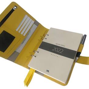 Agenda tipo fichário em Couro contendo, dados pessoais, calendários, datas importantes, anotações mensais, planejamento mensal, um dia por página (com exceção dos finais de semana), planejamento para o próximo ano, índice telefônico e lateral com marcações mensais.