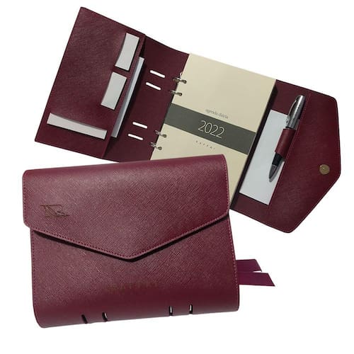 Agenda modelo envelope tipo fichário contendo, dados pessoais, calendários, datas importantes, anotações mensais, planejamento mensal, um dia por página (com exceção dos finais de semana), planejamento para o próximo ano, índice telefônico e lateral com marcações mensais.