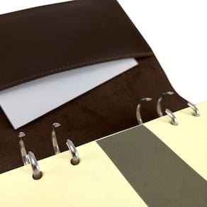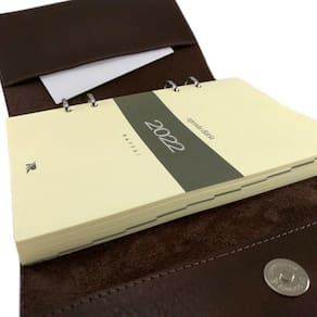 • Medidas 165 x 210 mm fechada, com aba para papéis e fechamento por botão magnético.