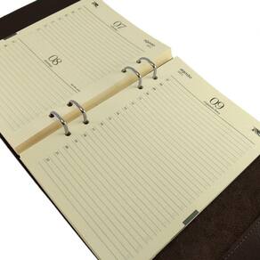 Agenda tipo fichário contendo, dados pessoais, calendários, datas importantes, anotações mensais, planejamento mensal, um dia por página (com exceção dos finais de semana), planejamento para o próximo ano, índice telefônico e lateral com marcações mensais.